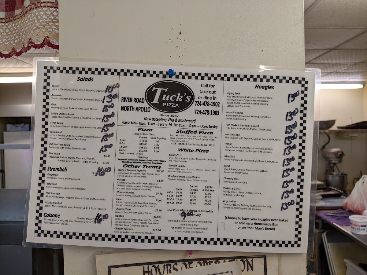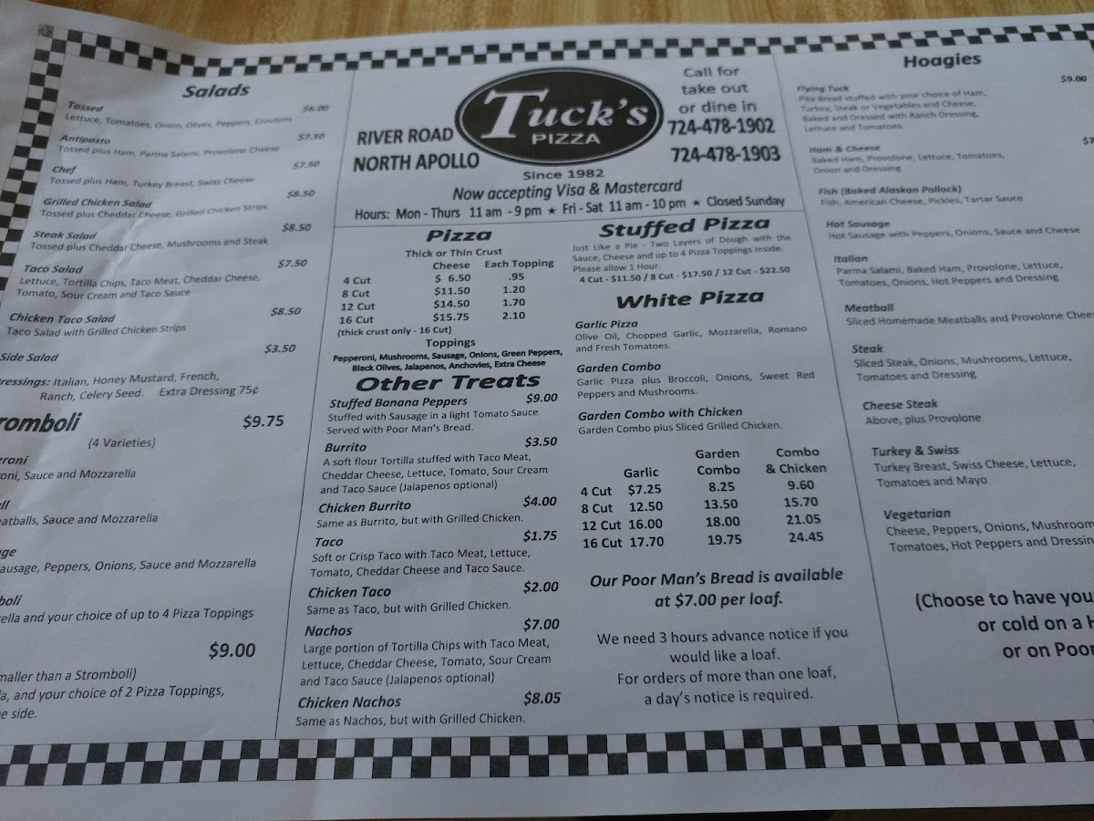 Welcome to Tuck's Pizza, where flavor meets quality in every bite! Located at 1922 River Rd, North Apollo, PA, this charming eatery prides itself on being a privately owned gem, setting it apart from the national chains. Tuck's menu boasts a delightful array of offerings, from mouthwatering Stromboli—featuring pepperoni, meatball, and hot sausage—to hearty hoagies like the signature Flying Tuck and savory meatball. Don't miss their Stuffed Banana Peppers and scrumptious tacos, which have garnered rave reviews for their freshness and flavor.